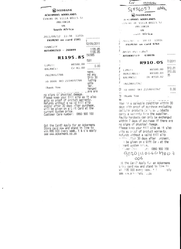 I would like to lodge a complaint about the following. I paid up my account on 26/7/2011 at the ackermans woodlands branch, after getting the settlement balance of r910.05 in branch.