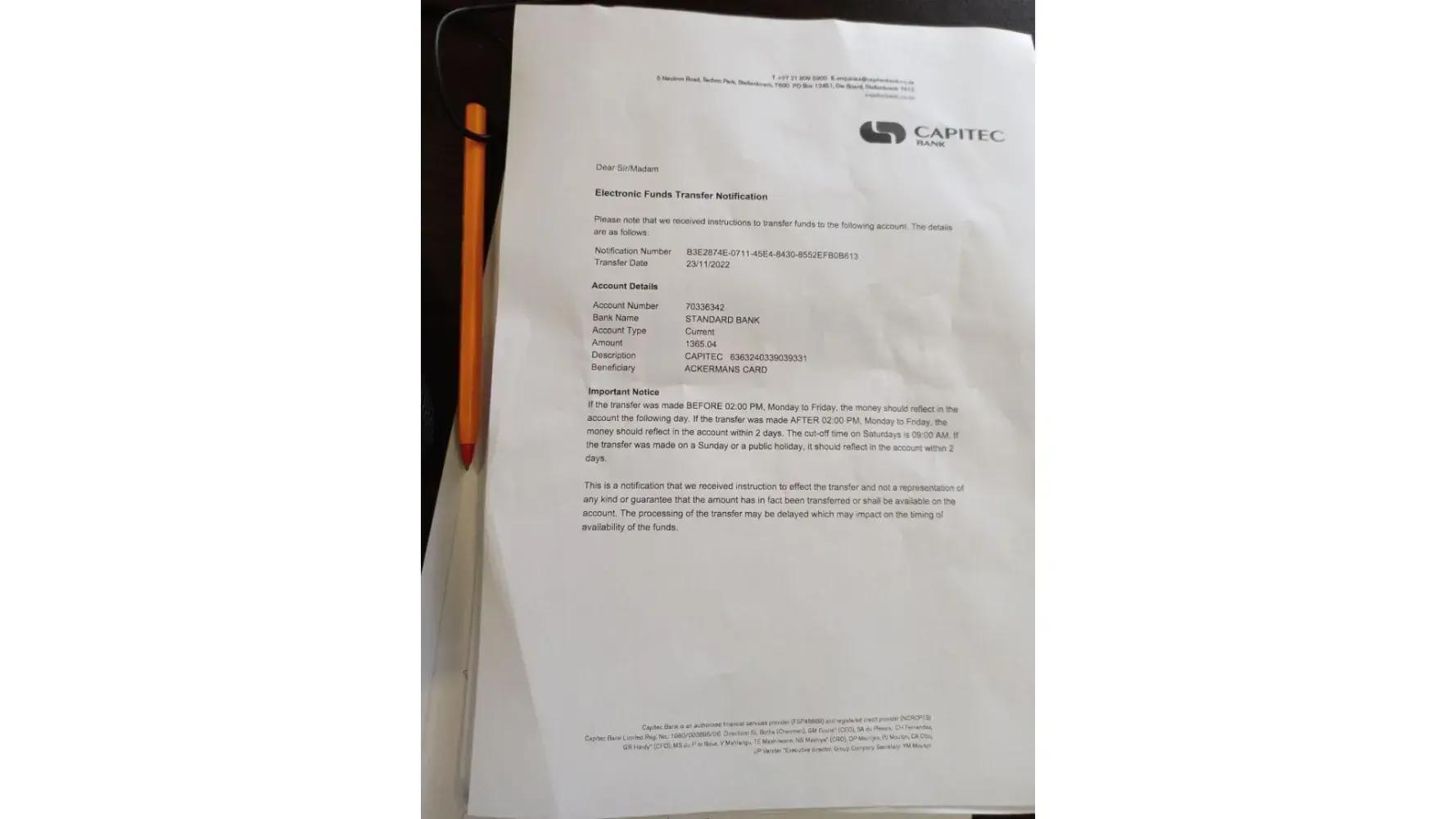 We deposited money into the wrong account R1365.04 today the 23 November 2022. We also went to the bank to try and reverse it but the bank said that their unable to do so. We must contact the Ackermans directly.