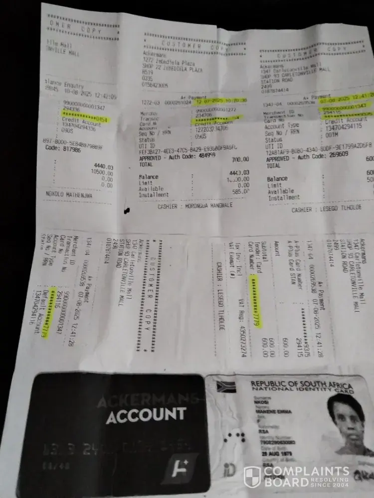 I went to ackermans New Redruth village cashier’s and Nandipha Matutu I went there to laybye the lady asked for my ID number only to found out she made a credit application without my concern