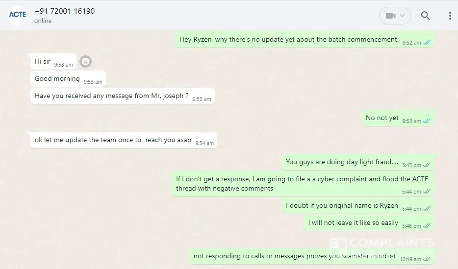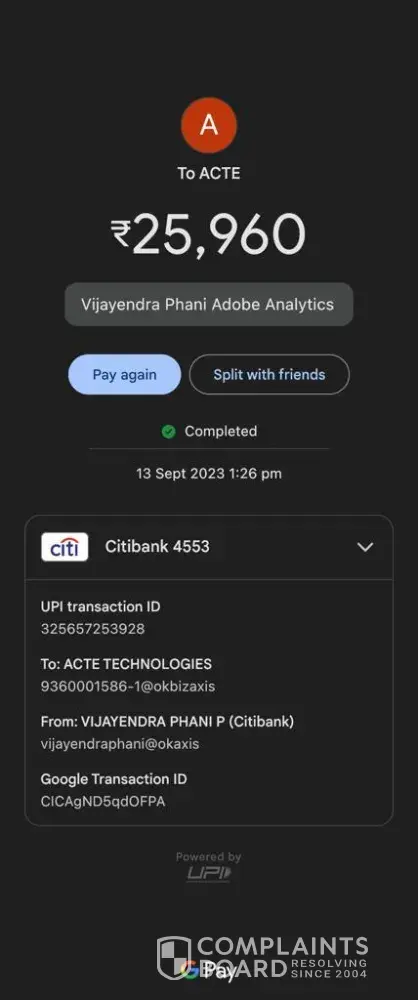 My name is Spandana. I am a resident of UAE(Dubai). I am basically from Andhra Pradesh, India. I wanted to get training on a Software Tool and hence searched for Institutes in Google. I Finalized ACTE, Chennai as the good Institute and consulted them. A guy called Richard answered my phone and encouraged me to pay the fees the same day. The Fee was Rs.22, 000/- . I paid them. Now I have been asking for the course for a month and have had no response from them. I even Emailed to refund my Money. No one responded to it. I am here attaching the Fees receipt, Payment screenshot, location details of ACTE chennai and the irresponsible chat history of the ACTE team. Please do help me in this regard. I need my Money back.