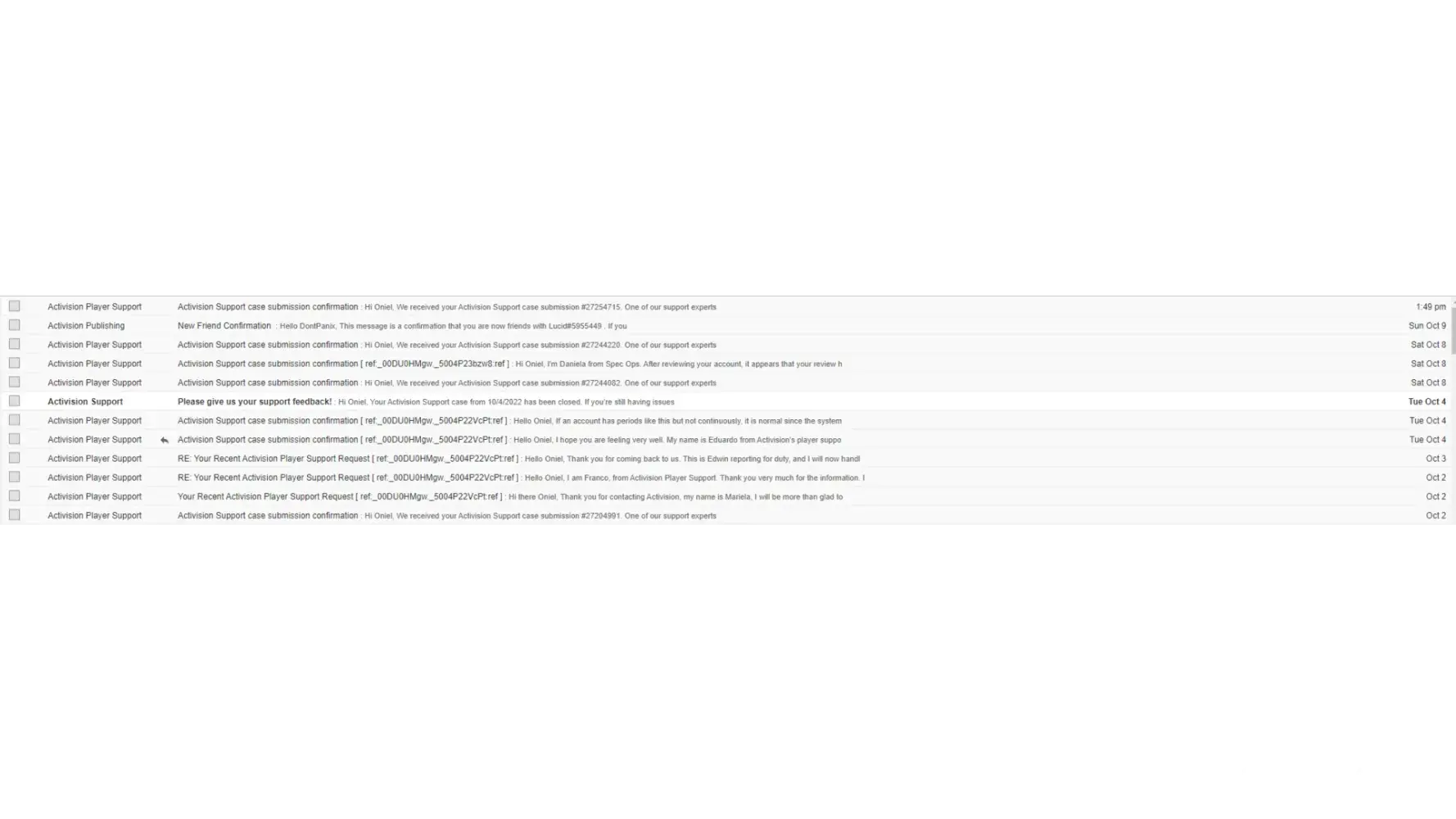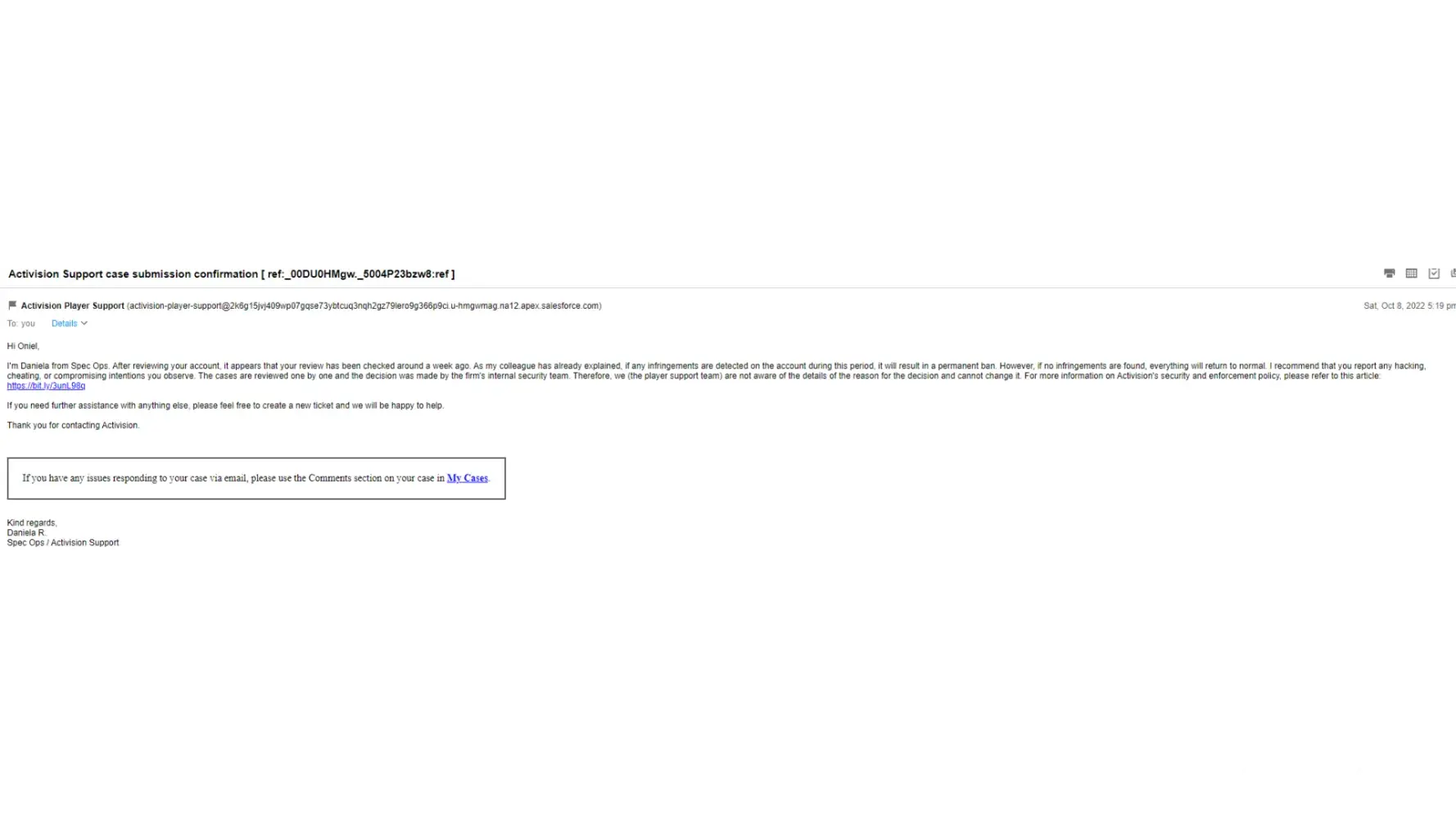 The picture below shows contact since the 2nd of October, it is now the 10th of October which is over a week not to mention the weeks prior to this time when it was already shadowbanned. I am currently still shadowbanned, and you can see I made contact and was answered immediately, same-day service. Fast forward to the 8th of October, I made another case, and it was responded to the same day when my last rep would help me accomplish absolutely nothing but reiterate the same sentences every other rep sta ed about if infractions are found on account what it will result too and it nothing is detected then things will return to normal, which is another lie because it has yet to do so. I made it clear already I understood them on that aspect but it didn't stop them from constantly saying it everytime with every rep, but my problem was how do I get it to stop and none of them provided me with an answer because they just closed the damn case the moment they responded. So I created another case the same day, and two days later no response. I closed the case and opened another one today, around 1:50 pm, still no reply, and its 9:30 pm. Previous emails took less than 30 mins to get a response, but now I wait days to get no response, so this is exactly why the support system on the website is garbage, and the fact no one has extensions to contact Activision or a phone number to legitimate customer service is a joke. Like how do you get in contact with the security team, tech support, help desk, or any other department in the facility, are they announced over a loud speaker or through a blowhorn? Sure enough they have phones at their desk right, I mean shouldnt all departments have extensions to reach that destinated part of the facility for help in that specific category in which they need help with? Its a rhetorical question by the way no need to answer, but all in all its unacceptable. Even if people called constantly with complaints, its the point of running a business, you have satisfied customers, and you have unsatisfied customers but to block all is just disgusting, well not all because some people have their Activision hookups I'm sure but to not have real-time services with back and forth communication because of angry customers maybe blowing up phone lines or whatever the reason their is no number to speak with anyone directly is insulting. Why run a business if you dont want to hear the backlash, why go about a process if you dont like the feedback, why do it all if you dont like the criticism when its expected. If anything it helps you grow because you understand the faults and decide to make it better or not, and for the ones who dont i.e Activision then it shows clear as day how the company values their customers input to unfair practices or changes to their account because of Activision's flawed system. I really hope I can get help with this issue and prevent future ones from happening because this is literally insane like not even joking on so many levels this is actually insane, and the fact its coming from a company who have had their feet wet enough for years to get this system in check and should have had the foundation in tact for this sorts of issues already taken care of previous years ago show that this company only cares about the [censored] they put out and who buys it. That is where all the focus and attention is placed at, making video games and still, they mess that up instead of focusing their damn attention to building a better structure service center for us with multiple ways to get help rather than 20 different links all bringing to back to that weak [censored] support page on their website that does nothing as well as representatives who dont truly care to help you. The support team who helps are not even the people responding for the hold on the account nor do they even know how to fix it or go about it since its not their department, so why the hell are we talking them when they cant help? Would you go to a supermarket and run to the deli section asking them about electronics? SOOO why are we getting help from people who CANT HELP US lol. Why am I not able to get in contact with the team who puts the account on hold or under review to understand what the hell is going on rather than taking word from mouth people who dont even know what the hell is going on there becasue they DONT WORK IN THAT DEPARTMENT.