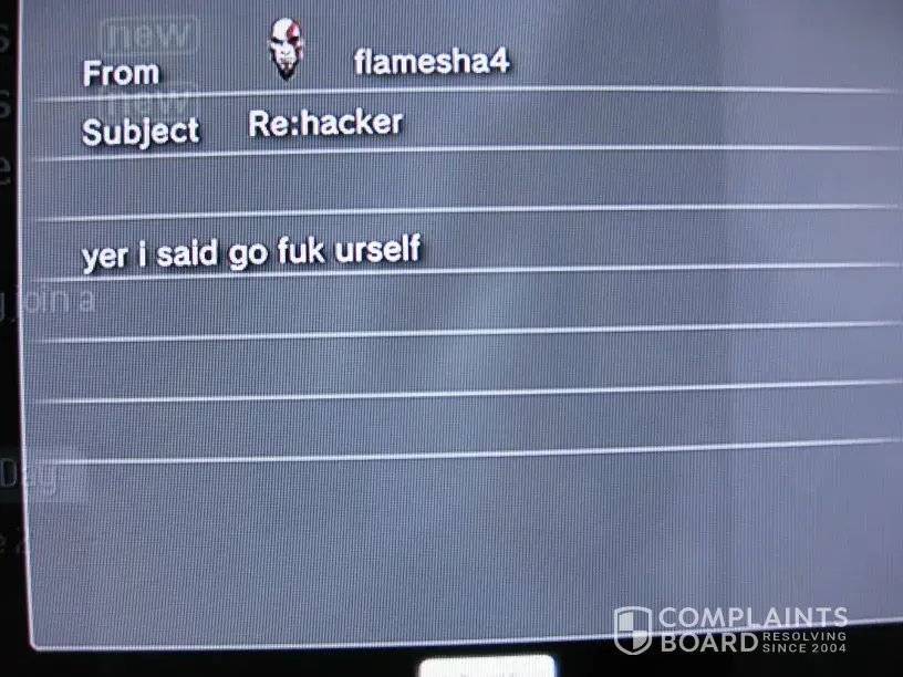 Hackers are widespread on Call of Duty 4 Modern Warfare Online. All parties involved Infinity Ward, Activision, Sony are not rectifying the problem or even telling its customers when the problem will be fixed. I am trying to report each hacker as I come across them (there are just too many of them). Now I am getting abusive mail from them and although Infinty Ward have said they have a fix for the problem Sony is still not responding. Disgusting behaviour from players and Sony. Pictures are attached of 2 mails sent to me with abusive language.