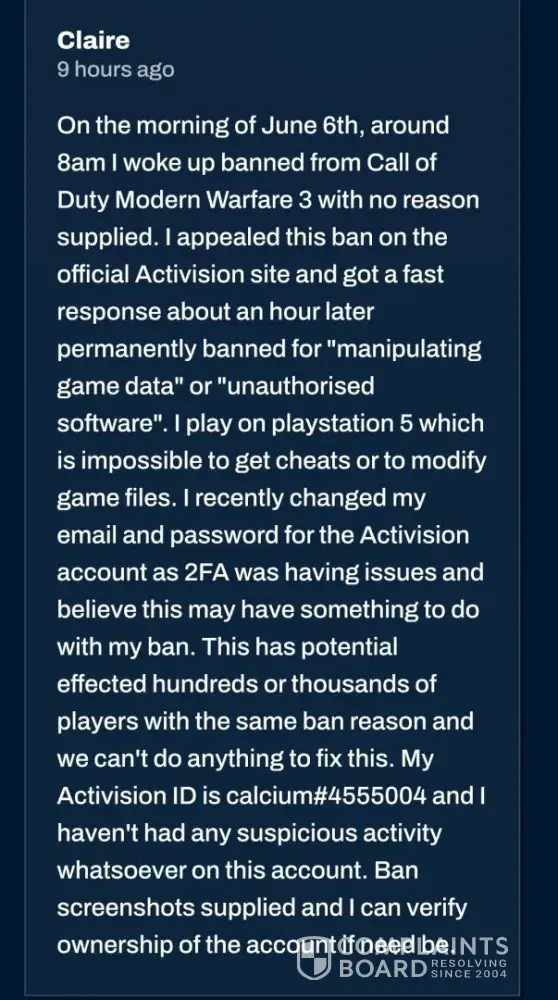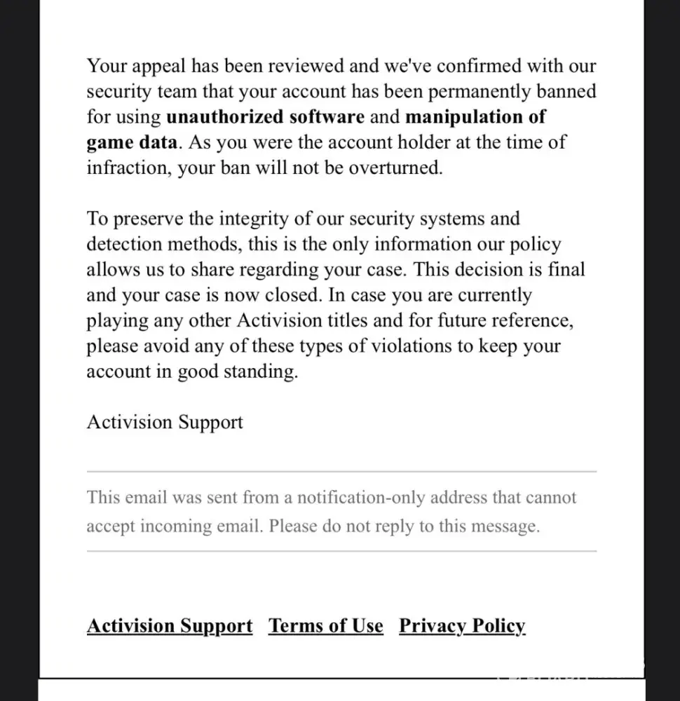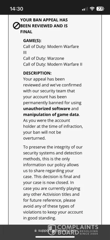 It happened on June 7th 2024. I was planning to play some call of duty modern Warfare 3, well I was about to, when all of a sudden I got a message saying that I was temporarily banned on the call od duty loading screen, made me wondered what I did wrong. So I went to Activision website and appealed for ban over there, after reviewing it, it got denied and it said that I'm permanently banned from playing call of duty and they won't overturn the ban. The reason they gave that I using unauthorised software and manipulating the game data. To be more specific I'm a console player and it's impossible to use random software on my console, I tried contacting activision customer support but nothing works. It just made me more frustrated, makes me think that activision is not willing to help. I hope they do smth about it.