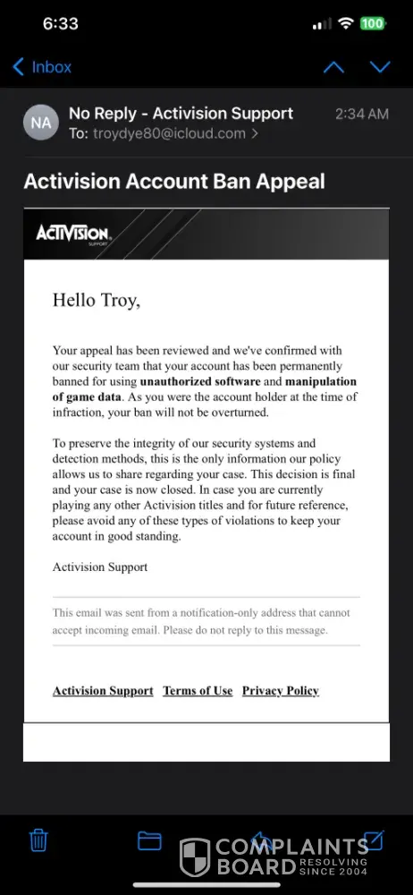 I have been playing Call of Duty for over a decade with the same Activision account, purchasing the new CoD every year. I have never hacked or used any cheats in my life. Activision states that ‘Bans will only be overturned if we determine the infraction was due to unauthorized activity on your Activision account.’ Someone gained access (hacked) into my Activision account and linked their Steam account to it, which resulted in my account getting permanently banned. I appealed my ban but was denied only a couple hours later with a generic response. I submitted proof to Activision, through the Better Business Bureau, showing someone hacked into my account. I also submitted a complaint through the California Attorney General. However, Activision has failed to look into the matter and have been unresponsive for a couple weeks.