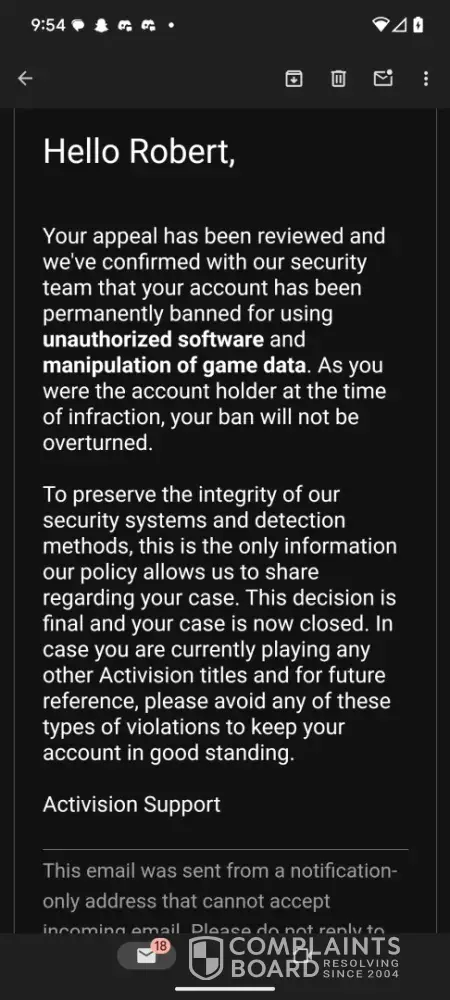 I have appealed my ban on Activision's site, still banned. I sent a formal complaint to battlenet, still banned. I even tried reaching out to them on twitter/ x. Nothing. As I live in the UK, I can't send a complaint to BBB (seeing as Activision only listen to them) unless I spoof my phone number, which is getting more and more tempting. The only issue is that's probably going to cost me.