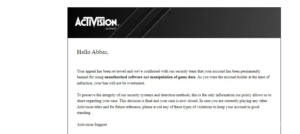 So I decided let me play Call of Duty with my friends on Monday after playing the MW3# beta and we were having fun and then I didn't get on until Friday and find out I have been perma banned on Activision, and I don't even know why. So my friend told me to try appealing the ban maybe you might get your account back and then I did and got a response saying I was using unauthorized software which I dont even know what that means. Like does that mean I was cheating? I have been playing Call of duty since 2011 and never would waste my time on using hacks when I grind the game, like now I don't really play because I am working now and dont get that much time to play the game anymore and do not have the time to grind the game 24/7 like I used to. All I want to do is keep playing Call of Duty with the boys and not have any trouble that's all I am asking for please unban me so I can play the game man.