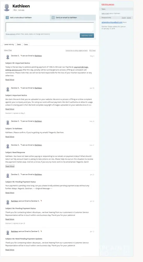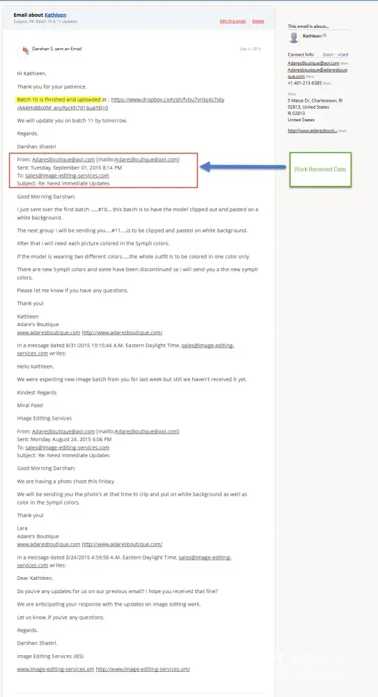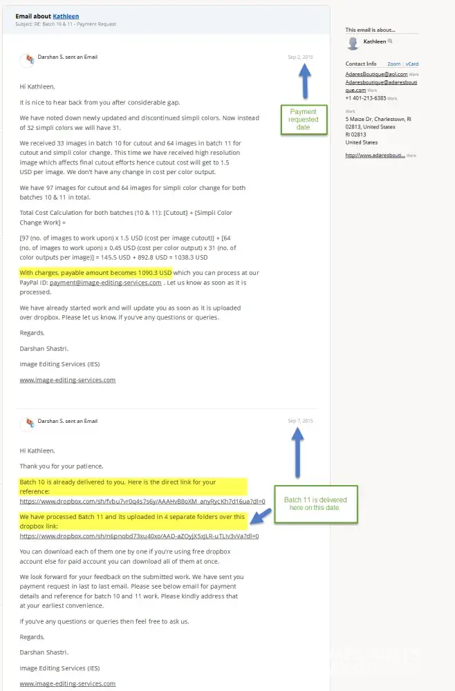 We (Image Editing Services – www.image-editing-services.com) are an image editing services provider from India. We were engaged with client Kathleen (http://www.adaresboutique.com/) [protected]@aol.com, [protected]@adaresboutique.com in providing image editing services where client used to make post payments on work completion and its submission.
