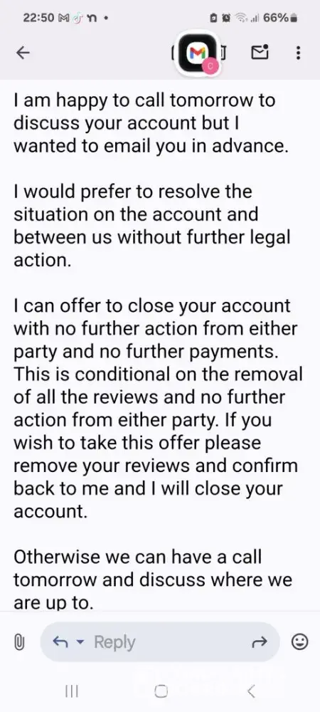“Don't bother with a bad review. Just report them for policy violations. I still think that they think that actions don't have consequences. They are sorely mistaken and it is this kind of company that Google is coming down on hard and removing them. I have also complained to company house for money that they took without permission and 3 other breaches. It is not the wild west anymore and bad business practice is not tolerated. Report, report, report. Honestly, if it was sketch the company would be a bag with swag written on it being carried by a man in a strippy top. This kind of behaviour is not acceptable anymore.