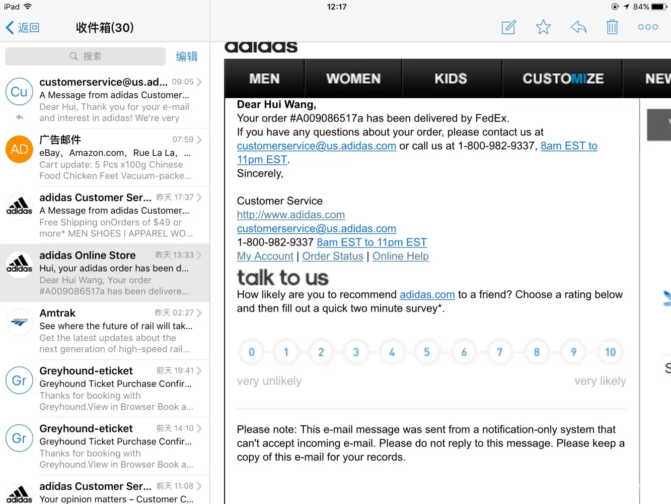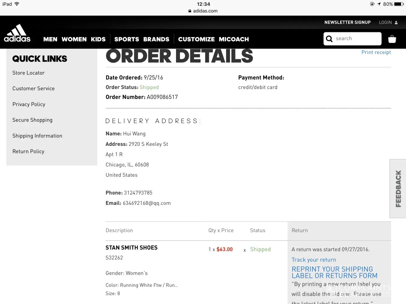 I ordered a pair of shoes through adidas.com/us on September 25th, and on September 28th I received a letter saying that my order has been delivered, but actually I really didn't receive.I asked the customer service where my order is, they just can solve my problem and they cannot assume responsibility for lost shipment and the service is really bad!