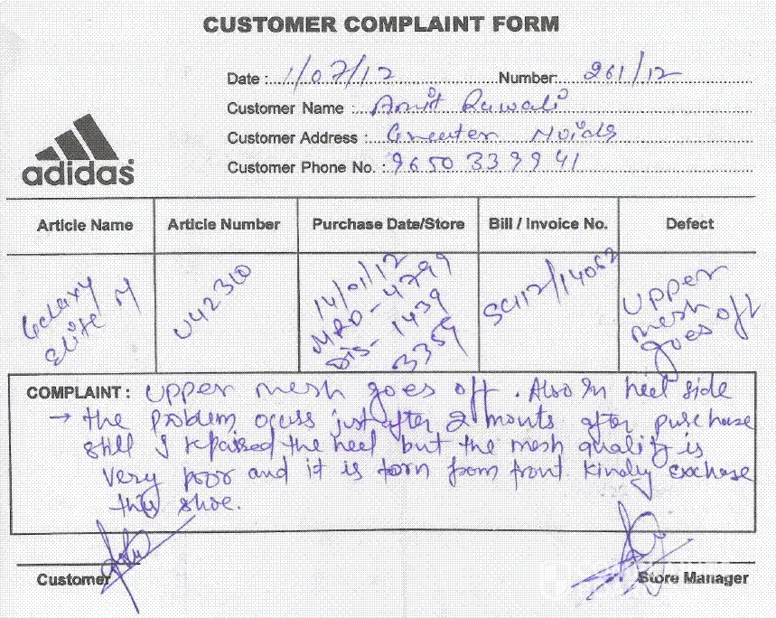 I purchased adidas shoes on .and hardly I used fifteen days. shoes were torn badly. I complained adidas factory outlets, chindwara from where I purchased. but they could not do any kind of help regarding this.
