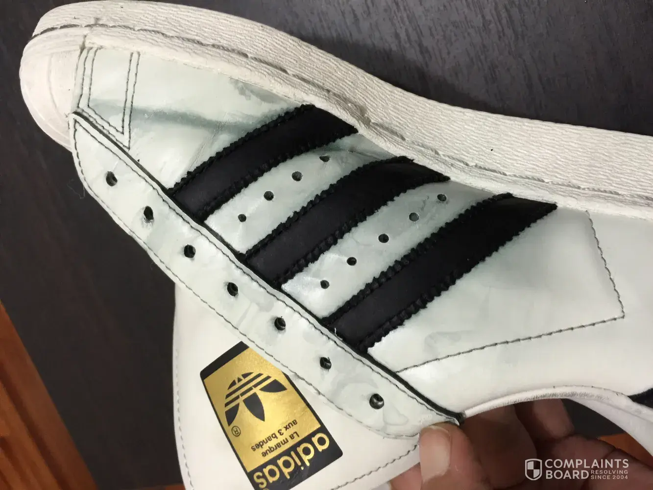Today had big raining in Bangkok, Thailand. I was outside and wear Adidas's shoe superstar white color with the strip black color. I can't runaway to any place must be walk until the rain lightly. When arrived home I just get off the shoe found the black color faded to the white area. It's really disappoint me because I just bought less than a month. I wait for long time find many countries from Thailand, Malaysia, Hong Kong till got from Wuhan's Adidas shop in China. Nothing much just let you know how I felt and want to hear some word to explain this issue. Please forward to relate people who in chart.