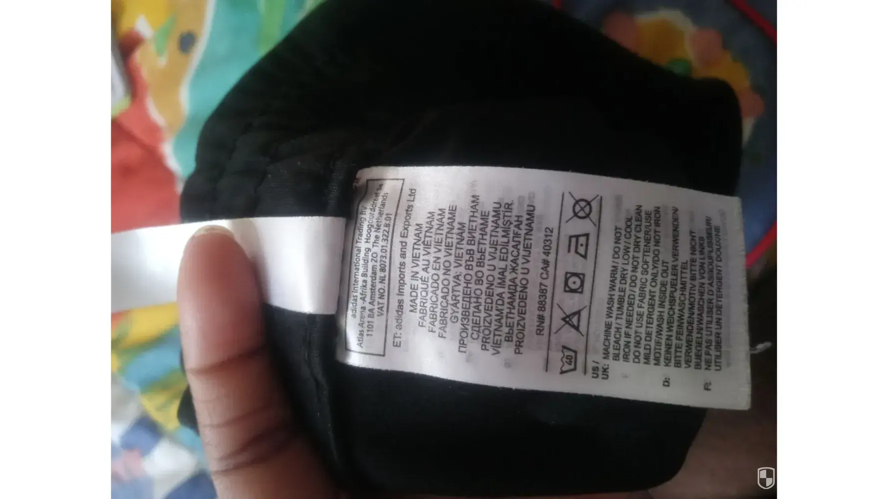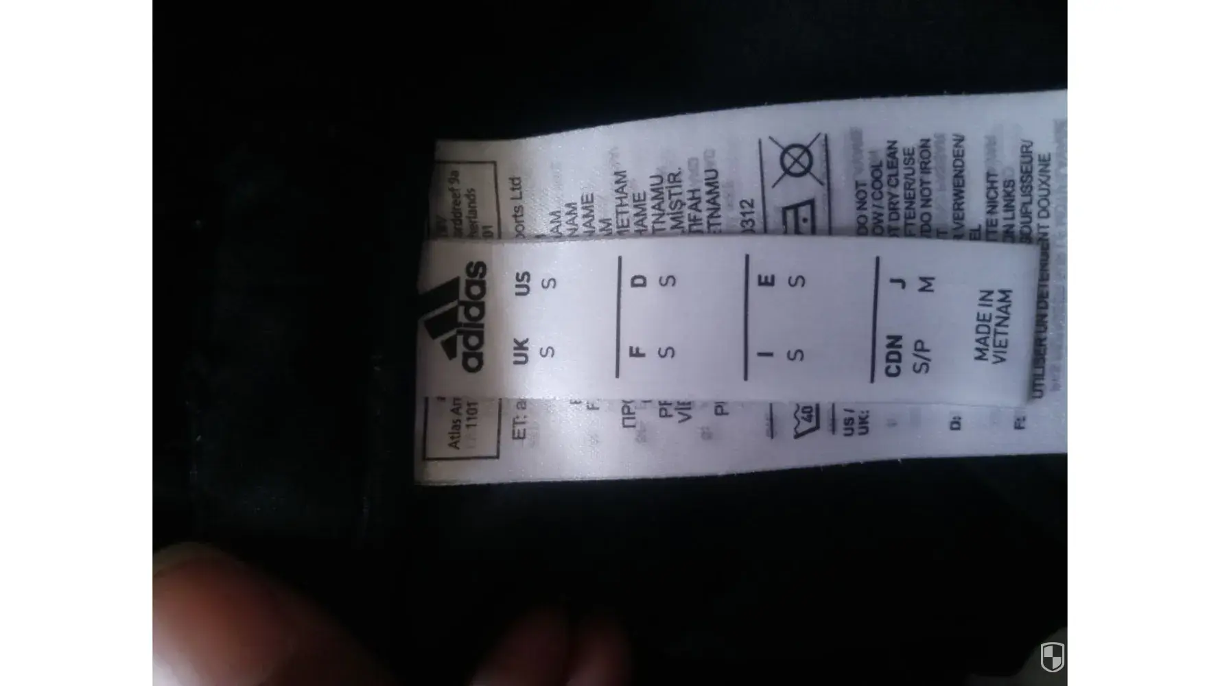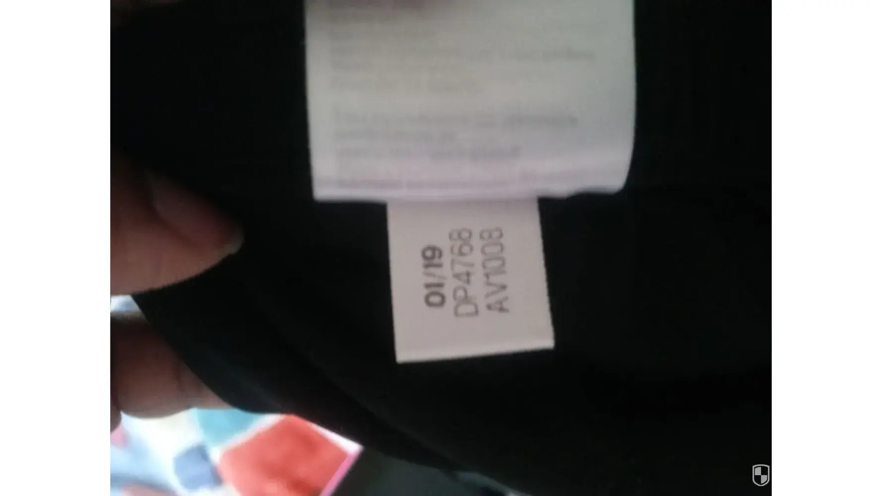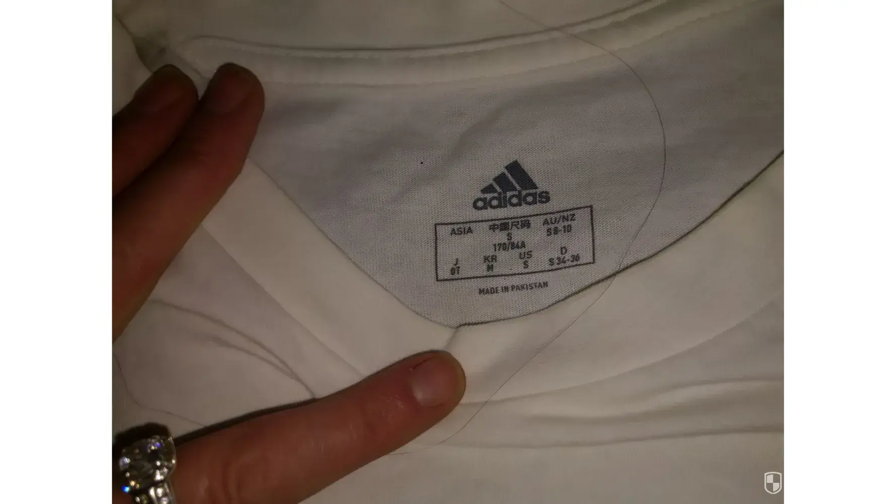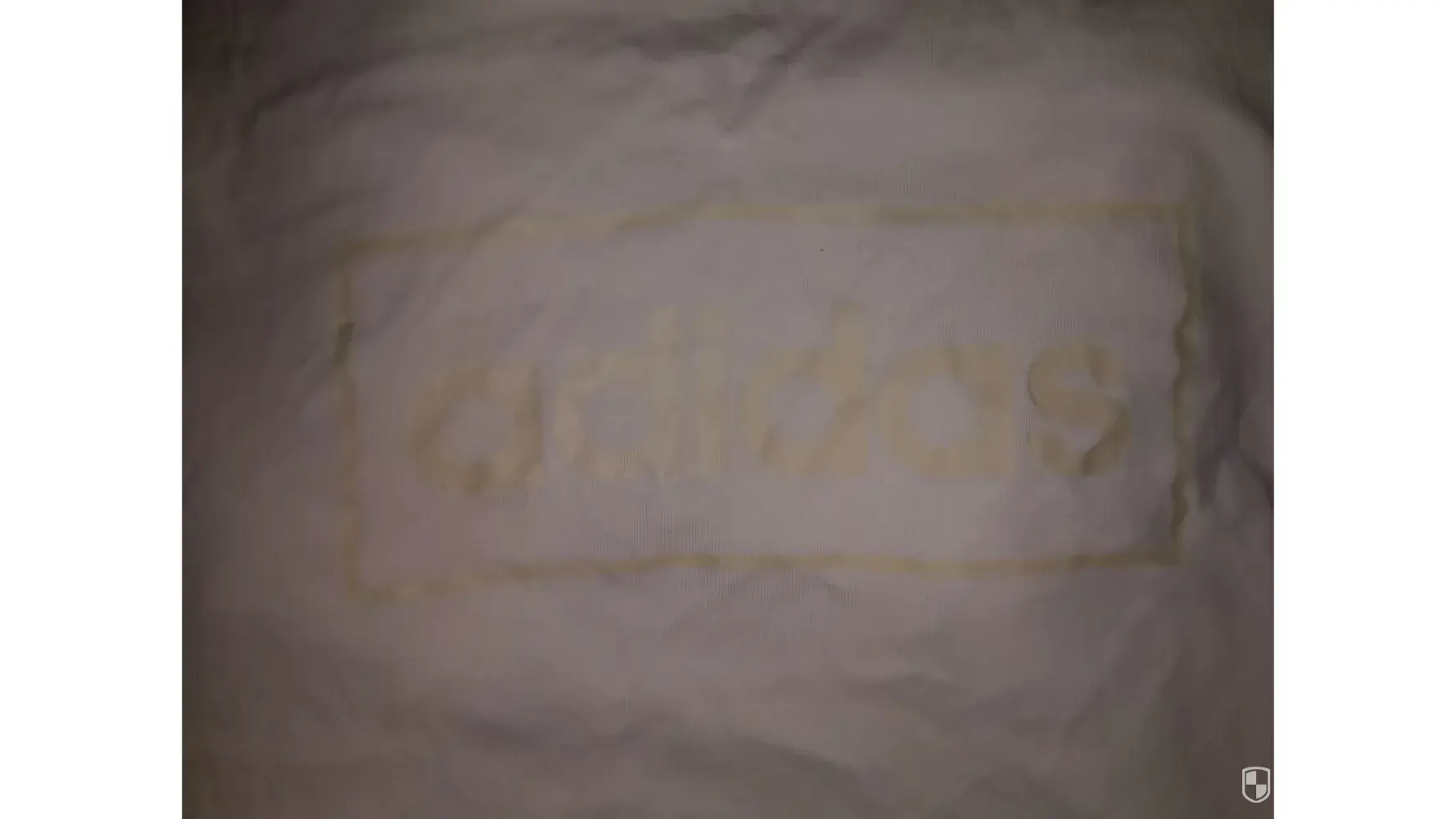 I recently purchased 4 different colored but same styled t-shirts on the same day. The back neck binding of each of these is printed with a row of white logos of Adidas and three stripes.
