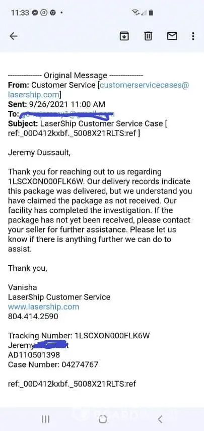 Lasership admitted to me over the phone that they lost the package. However, they failed to upate their tracking sytem to reflect that they lost the package. On the tracking information, Lasership noted that the package was delivered to the warehouse, and then in a one minute time span, it was loaded on the delivery truck, and in the next minute, it was allegedly delivered to my house. Laser ship was alleging that they delivered my package in the time span of 3 minutes. This is obviously impossible.