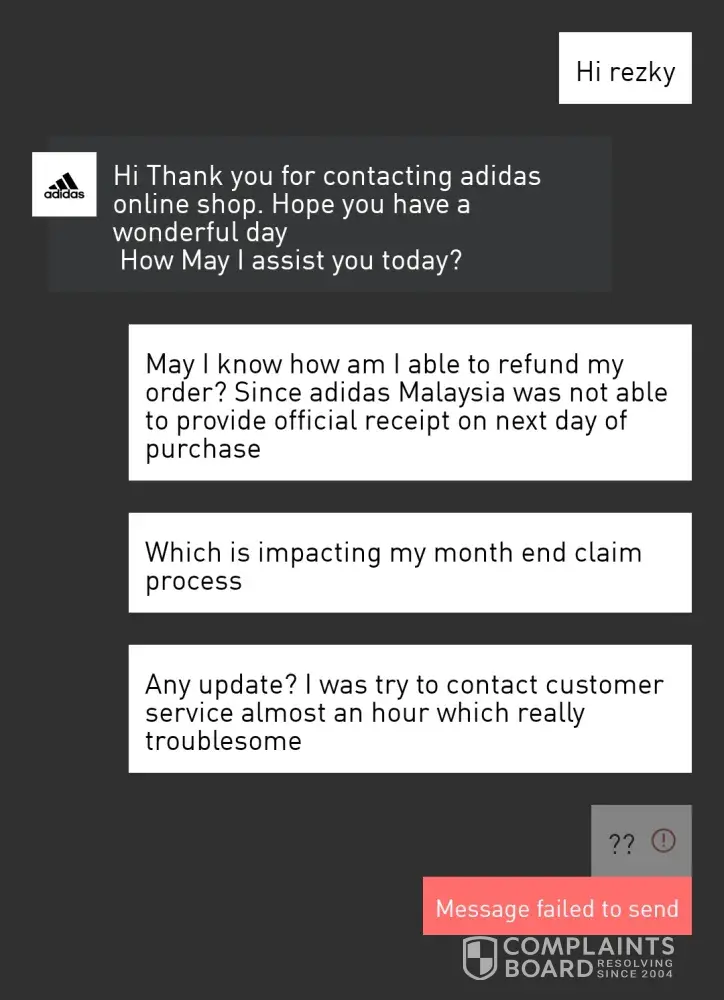 Adidas Malaysia have a terrible customer service system and which keep disconnecting automatically or service agent close chat from their end.