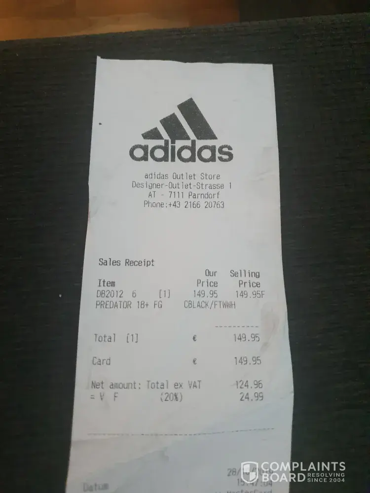 On 28/10/2019 I bought football shoes at the Adidas outlet store in Designer Outlet Parndorf in Vienna. To the cashier, I brought a box with shoes with a price tag of 34.95 euros. I paid for the product with a card and because I was in a lot of a hurry I didn't pay attention to the bill, thinking everything was okay.