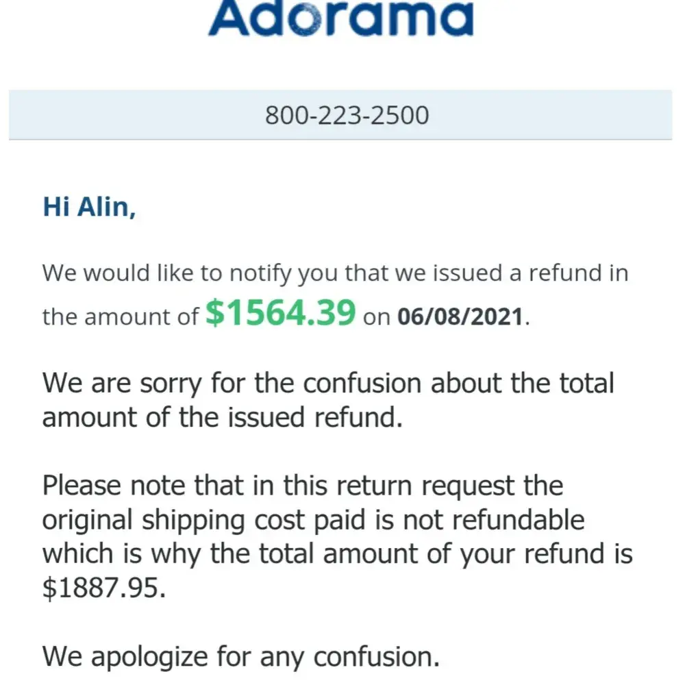 Purchased used from Adorama on Sept. 17, 2018. Received on Sept. 19th but it was defective and company provided a label to return it which I did Sept. 20. Adorama received it Sept. 25 and they have a policy of refund if sent back within 30 days. I have had multiple e mails saying that my refund is 'delayed'. E mails on Sept. 25, October 3 and October 11. I would like my refund without further delays.