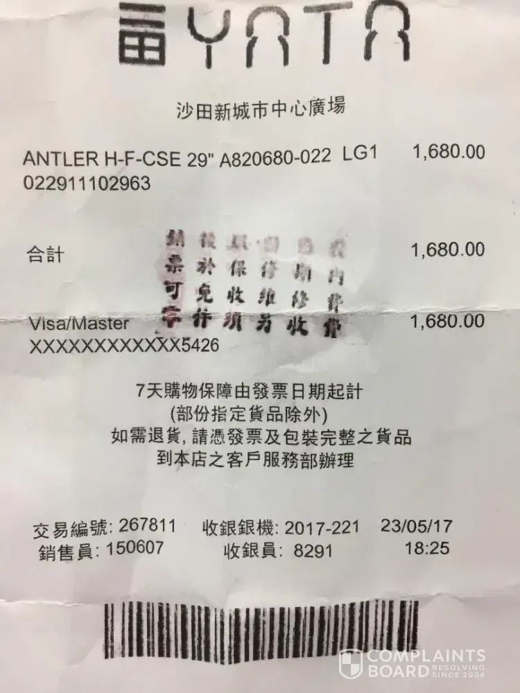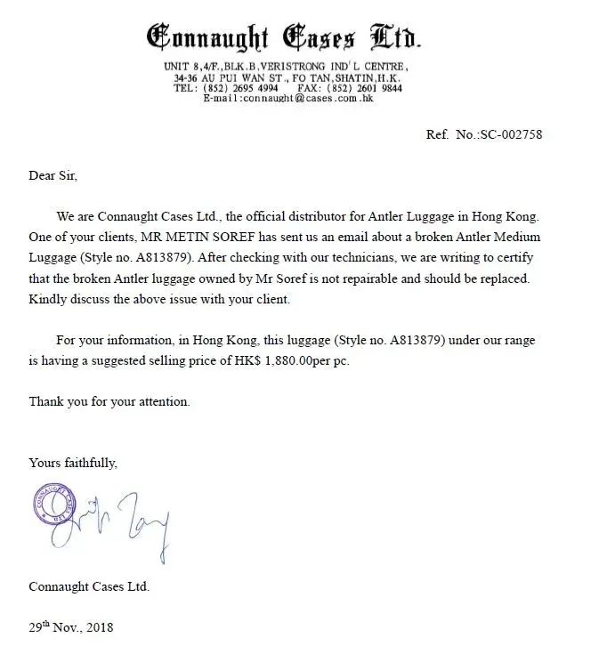 - Mrs. Zarina does not accept the invoice of my luggage ( which is attached). she said it is a copy, she wants the original. Even I explained the original was fax paper as the writing fades time goes by. she still insisted to get the original copy of receipt. I have contacted the store I purchased the luggage and got a letter that is proving I was the customer to buy the luggage from them 1 year ago and the price of the luggage is 1880 hkd ( 240 usd)