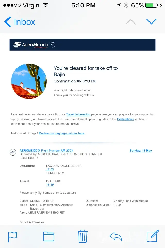I took Aeromexico flight from Tijuana airport (TIJ) to George Bush International airport (IAH). Following are my flight details:-