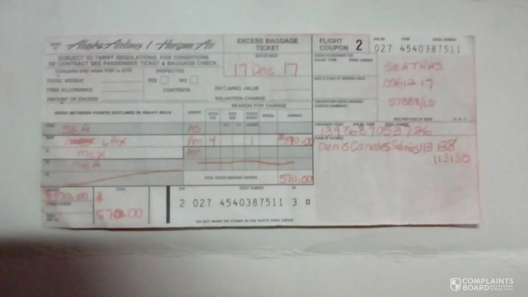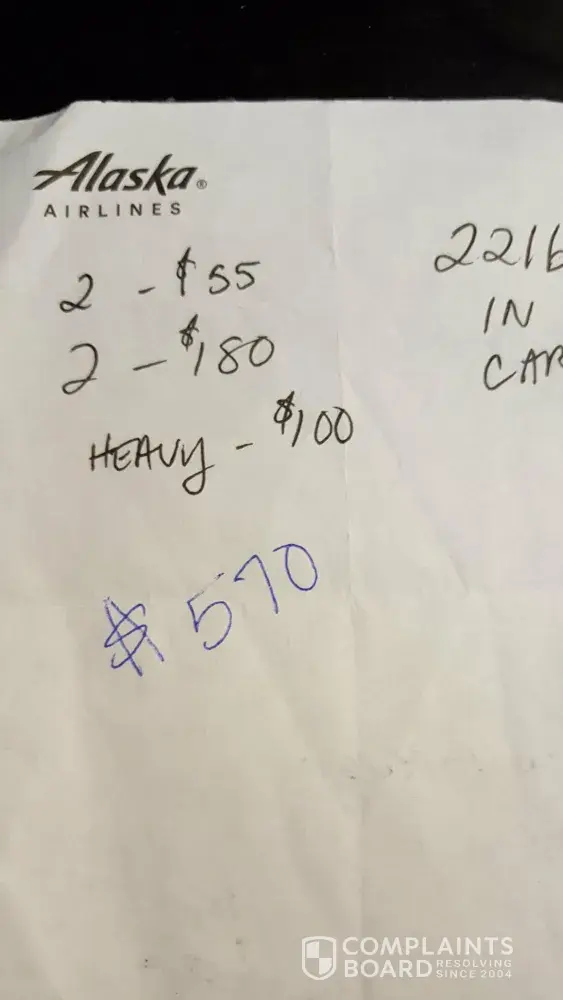 Alaska airlines se comunico con aeromexico, solicitando el costo de equipajes. y se nos cobro por 2 malestas $ 55.00 dolares c/u mas otras 2malestas $ 180.00 dolares c/u. y una de nuestras malestas tenia in peso de 57 libras = 7 lbs. de mas. por esto se nos cobro $ 100.00.