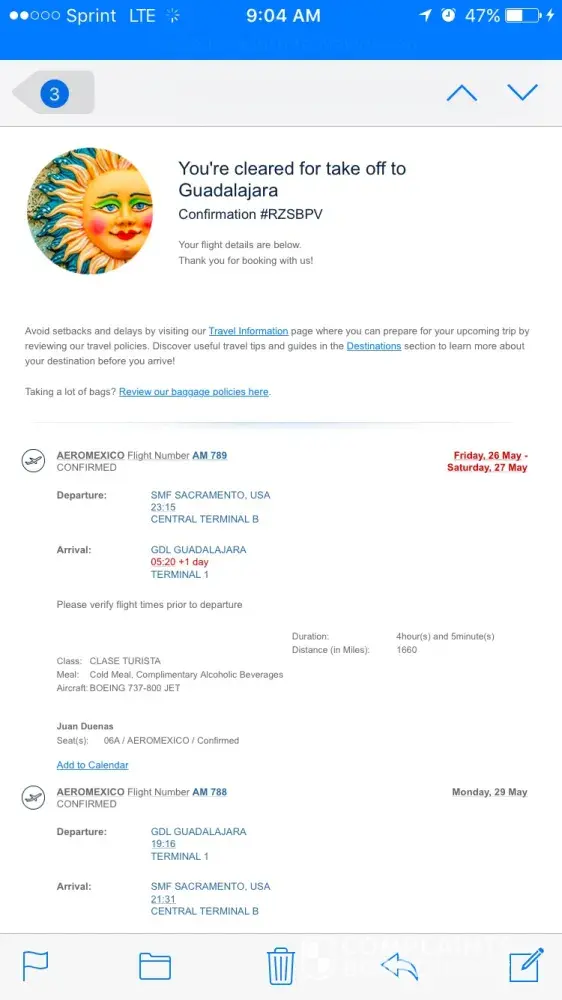 Returning Monday May 29 Flight #am788 Guadalajara to Sacramento.