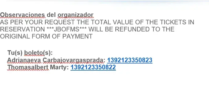 I called customer service by phone, and they said sorry we can't help you so I would like to know who's going to give me my money back.I have the passenger's names and dates on both of this reservation. Please email me back