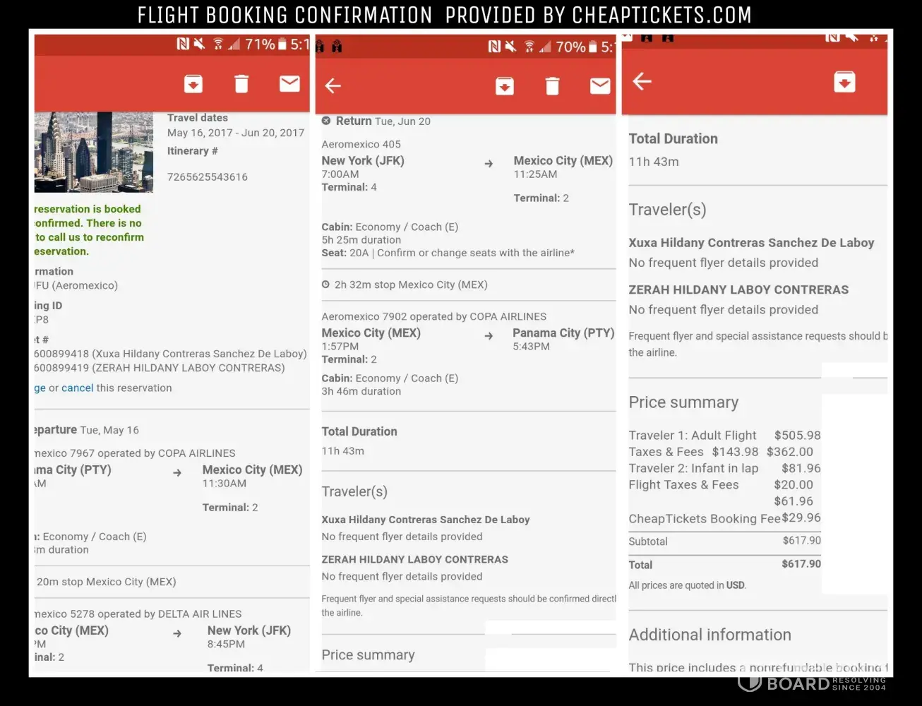 Jon may 16th 2017 my wife xuxa hildany contreras sánchez de laboy along with my daughter zerah hildany laboy contreras where supposed to be coming home to the united states of america from panama city, panama tocumen international airport under flight confirmation vdvjfu, after a long travel day and having been stopped by immigration because of a letter she had left back at the hotel, however the aeromexico airlines was immediately contacted buy via telephone at customer service and I personally leslie ivan laboy rivera made the call at around 6:34 panama time & 7:34 am usa eastern time from phone number [protected] to be able to change the flight for another possible available one, which I was willing to pay the flight changing policy fee, I know I asked for a courteous forgiveness because of the situation being that my wife is pregnant also was carrying my 4 month old baby and luggage which is a very a stressful situation to be in for a woman, however they did not consider to forgive the situation and they ask us to pay an additional $200 and $15 u. S. Dollars to change the flight, when I was going to make the change, the customer service representative which was so rude, arrogant and terrible in customer service towards me, she hung up the phone and did not call back, I then called again another woman answered who sounded just like her who then hung up on me again, after I asked to speak to a manager or supervisor even after waiting to get through, meanwhile my wife is at the airport struggling with all this stress, waiting for an answer from you guys to give me, then finally they answer, by this time it was almost 4 p. M. To tell me that there could be some flights available for the same day however I would have to pay $215 plus $150 for other fees, I said "you must be kidding, how can this be" the guy who was on the phone with me he asked me for my number which I gave to him [protected] and said unless I paid the total amount of $365 additional dollars the flight would not be changed, by then called cheap ticket and ask them to call aeromexico airlines and waited and you guys again said you couldn't forgive the penalty that I would have to pay about $400 for the change at this point I was so irritated that I called again for about the 11th time and I said i'll pay whatever amount of us dollars you want me to pay but please change the flight so that my wife and daughter can fly out tonight on may 16th, the the guy said hold on kept me on hold for a while finally after an hour and 34 minutes he said he can make the change for $215.18, the was gonna be set to leave panama city, panama at 9:23 pm and would arrive the next day around noon time on the 17th of may 2017, so I gave him the okay to go ahead make the change and asked him to please give me the flight number so that my wife can get to the airport and fly out to new york city j f k airport, the guy said okay, now give me your card information, I then proceeded in giving the he then charged my debit card pnc bank #[protected] the amount of $215.18 dollars keeping in mind I have booked a $200 hotel stay for my wife plus $150 dollars on transportation after she had returned back to the airport, to see the change in the flight reservation the person at the copa airlines said there isn't any change to the flight from pty airport panama city panama to john f kennedy airport,