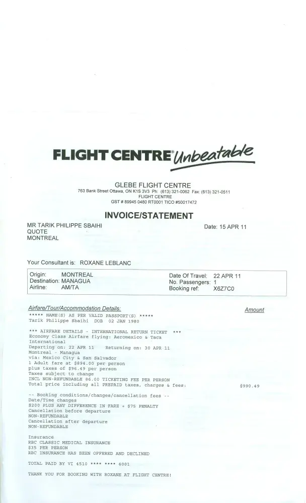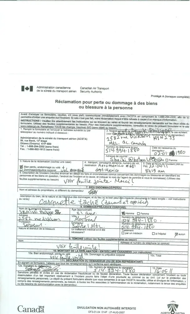 Cette lettre est pour vous informer de l’incident survenu le 22 avril 2011 à l’aéroport pierre-elliott trudeau vers 8h19am. ce dernier a eu lieu au comptoir des douanes d’embarquement et vérifications des bagages à main.