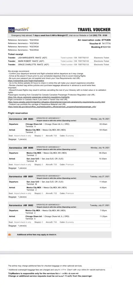 Aeromexico flt. #683 on jy 19, 2021 chicago to costa rica, with a stop in mexico city