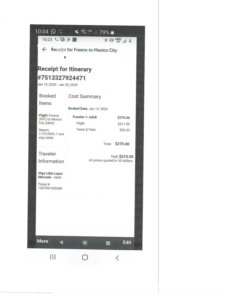 El dÃa 14 de enero de 2020, compre un pasaje para el dÃa 01/19/2020 (Fresno Ca- Mexico D.F ) RECEIPT FOR ITINERARY # [protected], PASAJERO OLGA LIDIA LOPEZ MERCADO TICKET # [protected] (Mi esposa)