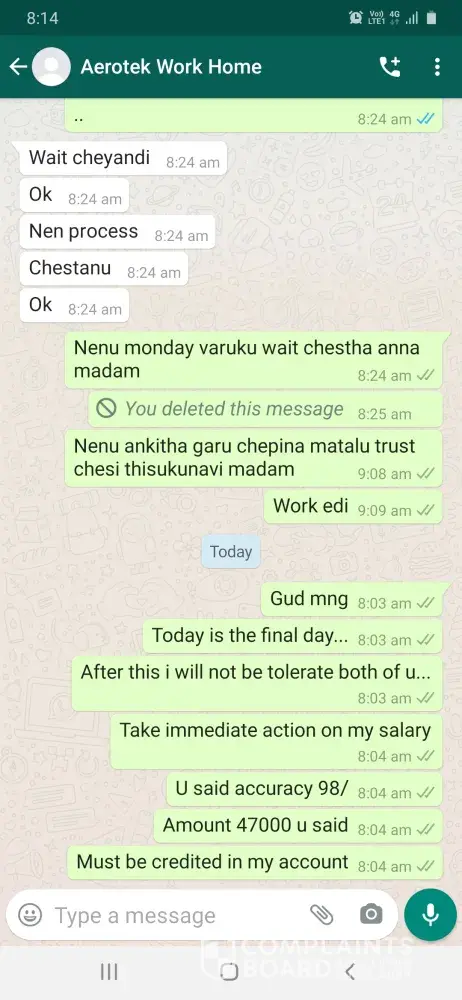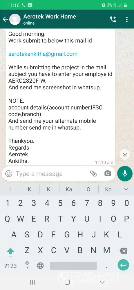 I Pappala Swamy Devendra Kumar Vijay, completed "B-tech mechanical" in the year of 2017. Actually, I saw some cheating experience from past 15 days. One day I get a call from Anikitha Garu and she said I am working in Aerotek company., She asked do you want to do a work from home job. I said yes, she gave an "Aerotek" "MS Word" projects you should be completed in 15 days that's she said and given some fake employee ID also. And I believed her and taken the project and completed in 15 days. So, finally I submitted the project to her mail address and she said wait for 3days. I sincerely waited 3 days, she called me and said your accuracy is 98 percent and you will get 47000 rupees... And taken my bank details... She never credited the salary... So I am taking step to complain to "police about your company fraud" and complaint to the company for the employees creating fraud to other peoples by the brand of your company... So please take an immediate charge on this and punish them and credit my salary. I am going through complaint a file in police station and I approach a lawyer.