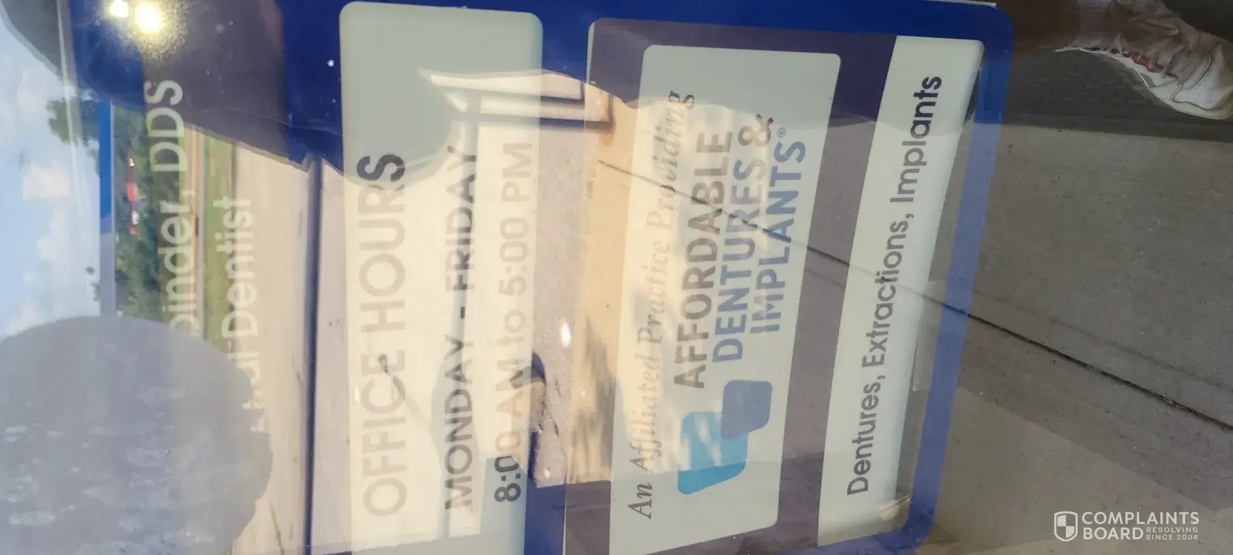 I would like to file a complaint against the new dentist at the Bloomington, IN location and the office itself. Since I started my treatment plan I saw Dr. Goodpasture who was the one who assisted me with my treatment plan along with my dentist in Bloomington, who referred all of her denture patients to that local Affordable Denture’s office at that time. Because Dr. Goodpasture was so good to work with her and her patients as well as having a good reputation. My treatment plan was to go to an oral surgeon and have him remove my teeth and insert 2 posts on my bottom for anchoring my bottom denture. The reason for this is because Affordable Dentures only uses a local anesthetic and actually pulls each tooth. I had almost all of my teeth that needed to be removed. Everyone agreed that it was in my best interest to have an oral surgeon do the procedure. While I was out and already having work done Dr. Goodpasture said that it would be better to have them put the posts in while they were already working on me. It would be less recovery time for me. I was referred to the best Oral surgeon in Bloomington by my dentist and Dr. Goodpasture. I was told that four posts would be better than two and I may still have some movement with just two. So I was prepared for that. What I was not prepared for was the constant change over in dentists, (4 to be exact), that occurred during my treatment or the fact that I never saw a dentist again throughout my entire treatment other than the first appointment with Dr. Goodpasture. The two dental assistants in the back did every single thing for me and they were the only ones overseeing my treatment plan. I did call the 1-800 number and complained with everything that was going on and they suggested that I change to the Evansville office because it was closer to me. However, when they received my records they were unwilling to take me as a patient. They said it was because another dentist was involved and would not explain it any further.