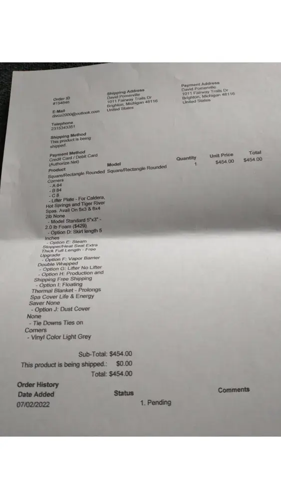 I needed to replace a hot tub cover for my hot tub. I searched on line and found a dealer that offered free shipping and seemed to be reputable at the time. The name of the company is Affordable Spa Covers (affordablespacovers.com) in Clearwater FL. I place an order for a new spa cover on July 2, 2022 and the immediately processed my order ID #154609 to my credit card in the amount of $454.00. I was told it would be from 12 to 16 weeks to manufacture the cover and get it shipped to me.