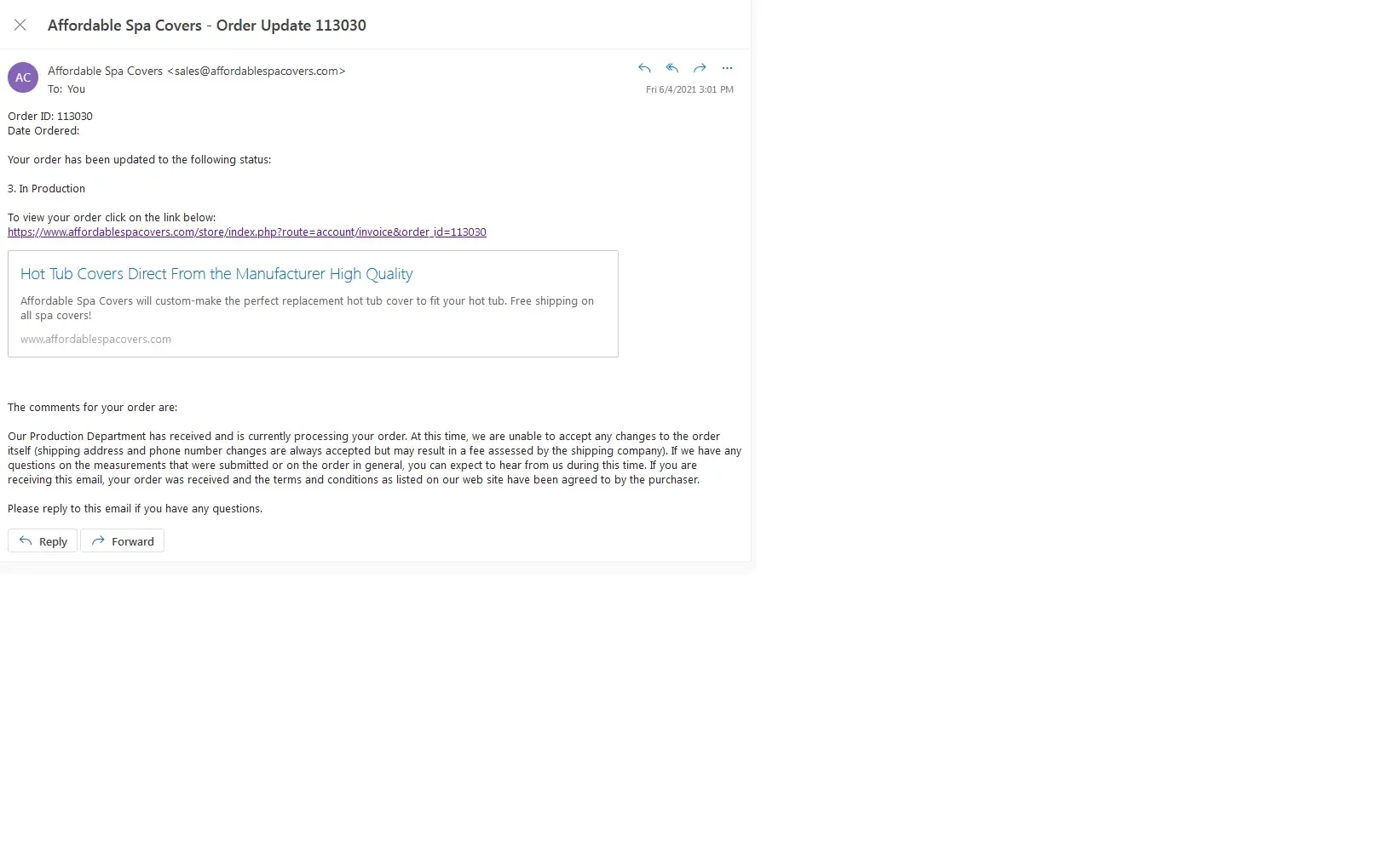 Subject: FW: Affordable Spa Covers - Order Update 120561