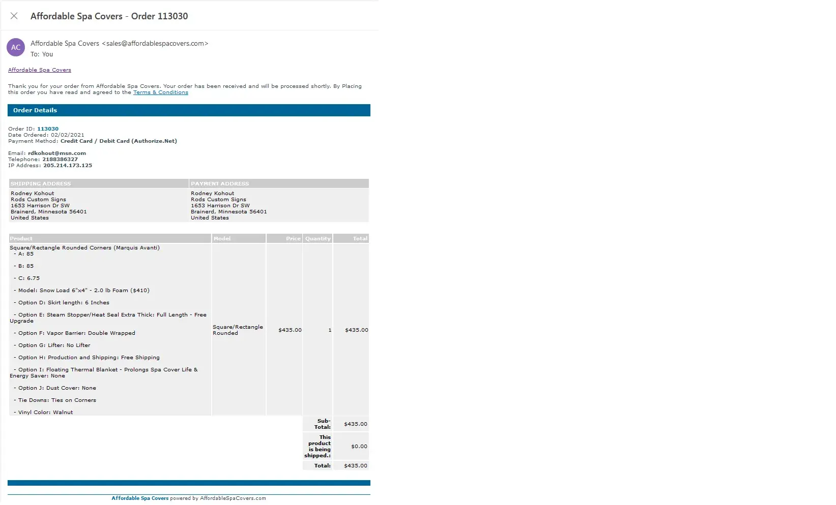 >>>> Subject: Re: Affordable Spa Covers - Order Update 120561