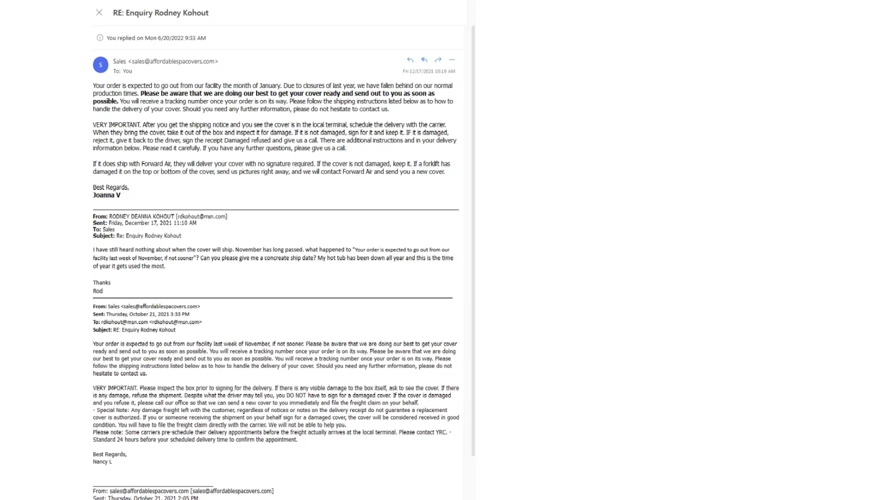 From this e-mail thread, you can see that I repeatedly reached out to you about the status of our order placed 4/29/21. I did call to cancel the order on April 11, 2022, and was not told about the $150 cancellation fee at that time; instead I was assured that it would just be a "few more weeks" until my cover order was ready to ship.