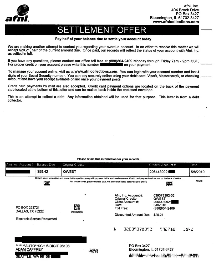 I received this notice from AFNI Collections, stating that they "acquired" this account for collections. This notice is saying that I owe nearly $100! I cancelled my QWEST account a year ago, and I paid my final balance to them! I have never received a call or letter from QWEST saying that I still had a balance owed. They do have my correct phone number, but that is easy enough to find since I have had that same number for many years (with QWEST). This is so infuriating, because I the letter looks very real and threatening.