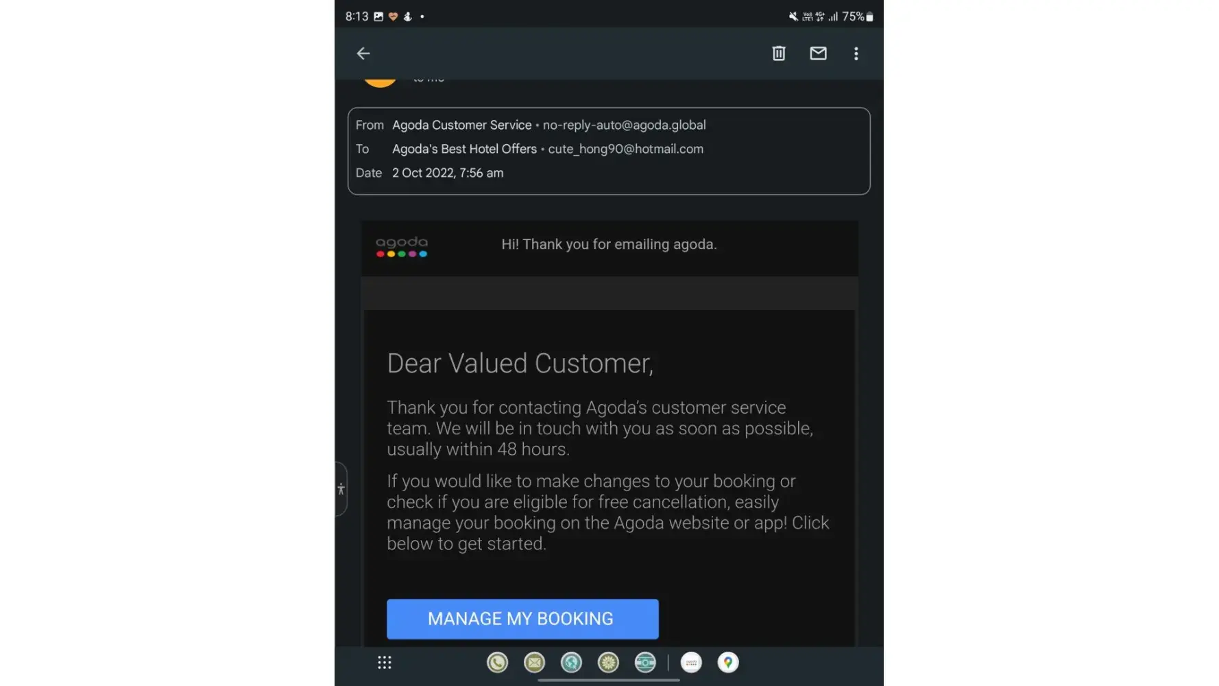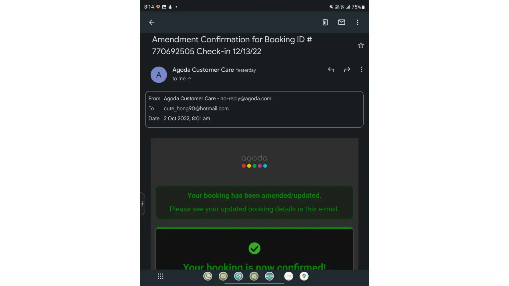 Saya membuat tempahan PADA 30/09/2022 melalui apps Agoda. saya dgn tidak sengaja tersalah pilih tarikh tempahan ( paid RM275.03), Dan segera memaklumkan pihak Agoda selang 5min temphn dibuat untuk penukaran tarikh. Malangnya, keesokan harinya saya menunggu 6 jam d luar hotel tetapi pihak Agoda hanya kata ' no response from third party' wal hal pihak hotel membolehkan untuk tukar tarikh. Duit saya RM275.03 lesap (RUGI) begitu Saja. Saya ingin duit saya semula!.