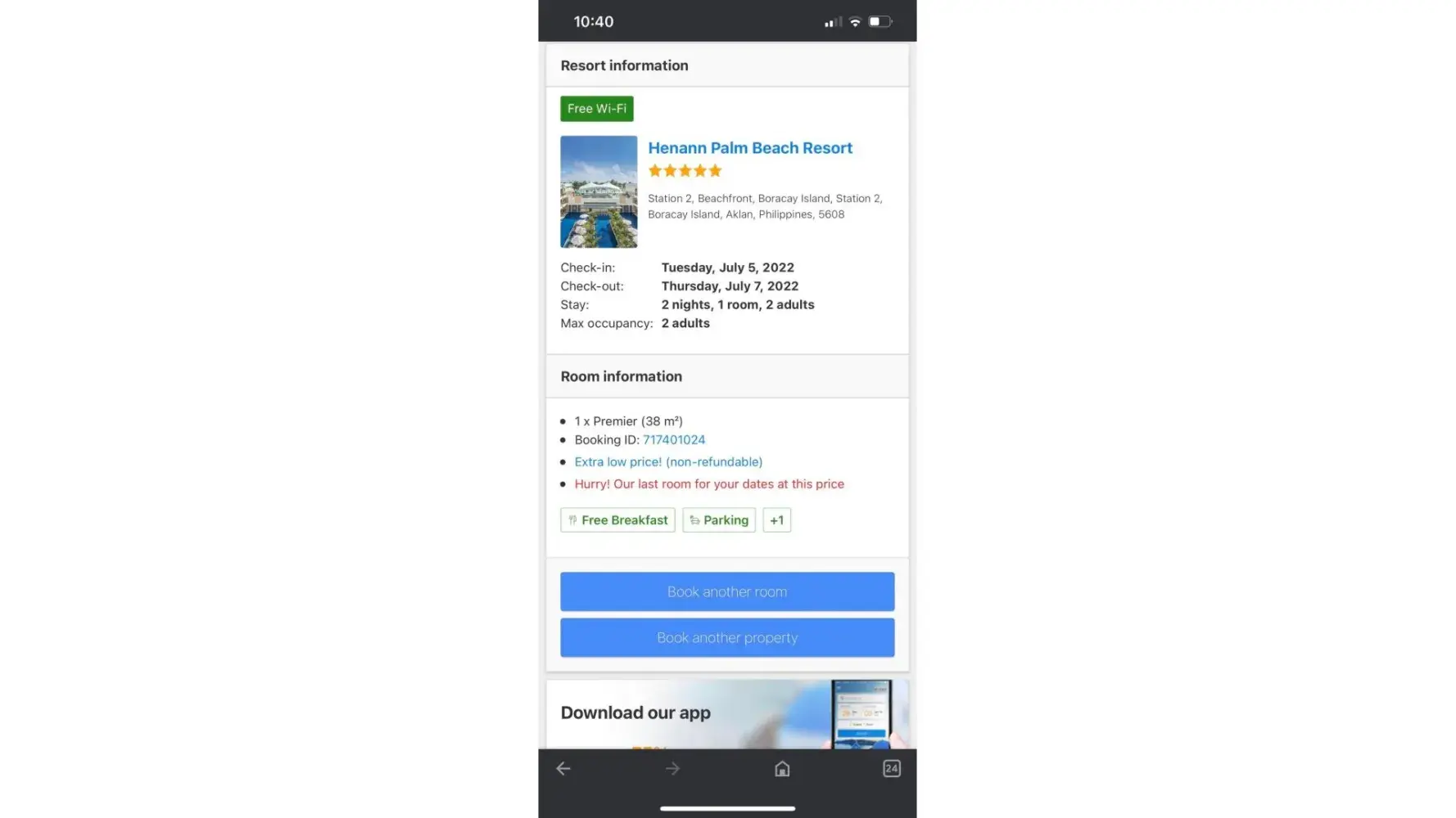 It has been 5 day with no reply. To all who read this stock up on toilet paper before you buy from any of them. You will need it to clean up. The booking was for the Hotel Chrome in Montreal 6/23 to 7/5/2022 for Jeffrey Fichtelberg