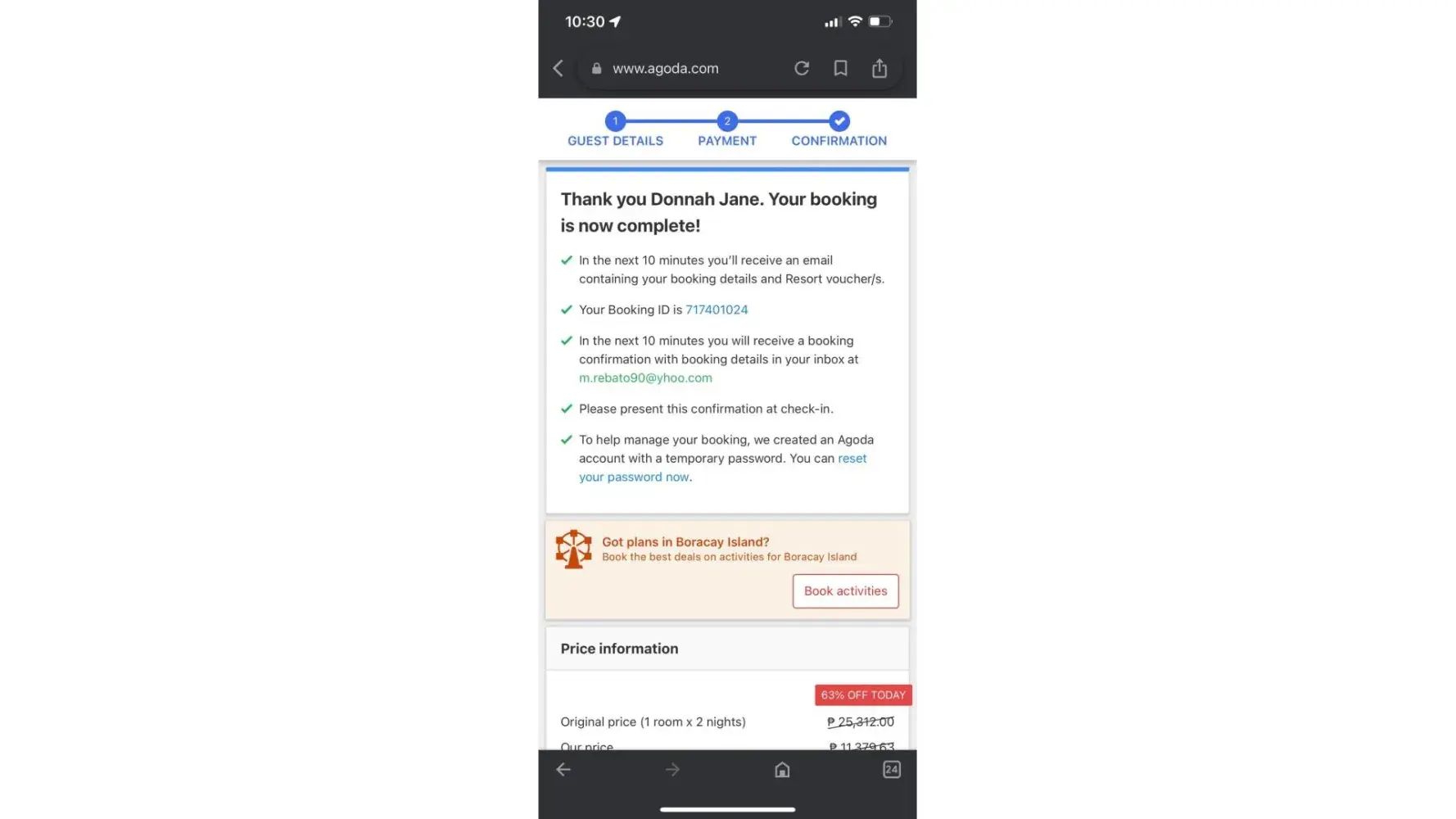 I did not recieve an email confirmation on my booking in Henan Palm Beach Resort Boracay for 2 nights.with booking ID: [protected].