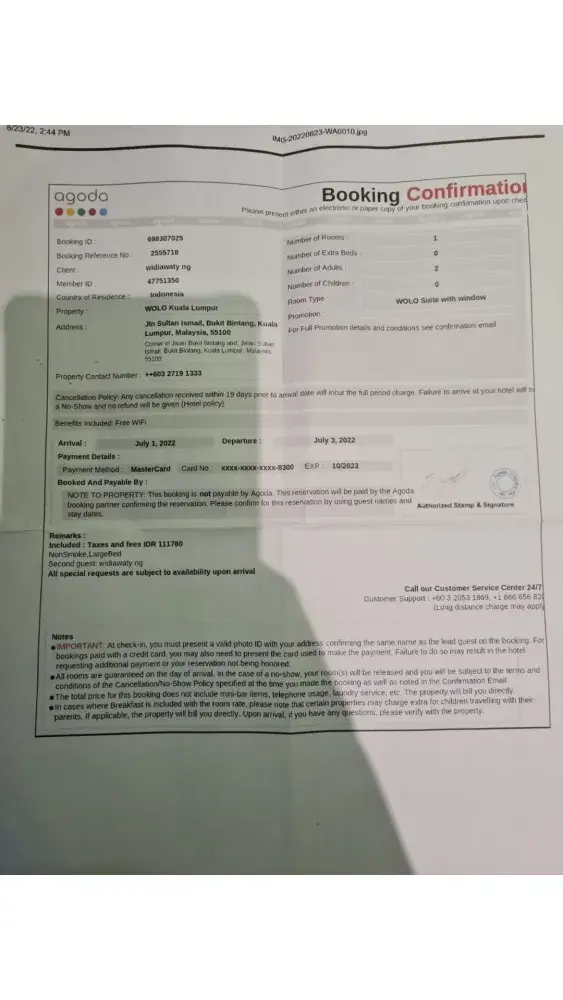 Unfortunately I was tested covid positive on Jun 19 and under the Singaporean covid protocol, I had to be self isolated. There was no chance for me to move around to check in the hotel on Jun 22. I asked Agoda for cancellation and refund as this is a force majeure case, though I understand the bookings are non-refundable.