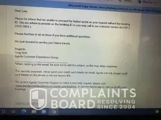 Approx 15 mins later I get an email from the hotel asking me to make payment to their bank a/c otherwise they cannot guarantee my reservation. Why should I transfer money to the hotel when Agoda had just charged my card ? Alarm bells started ringing and I canceled again.
