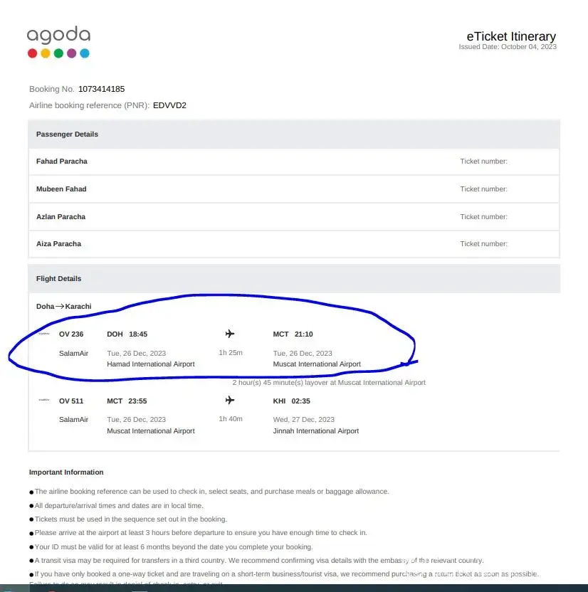 During the same period, I had open communication with Agoda regarding a separate flight from Karachi to Doha on December 19, 2023. I explicitly requested not to cancel this flight, and Agoda promptly acknowledged and respected my request. It is my belief that due to a possible oversight or system error, the Agoda team mistakenly associated the communication about the December 19 flight with the December 26 reservation. This error led to the unilateral cancellation of the December 26 flight without my explicit consent, causing this entire episode. Unfortunately, Agoda has chosen to place the blame on me, despite the lack of evidence supporting their claim.