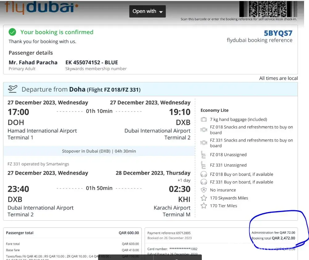 Claimed loss: New Flight Ticket (December 27, 2023): QAR 2472Extended Hotel Stay (One Additional Day in Doha): QAR 148Total Additional Expenses: QAR 2620Deducting the refunded amount of QAR 1479.03:Net Reimbursement Requested: QAR 1140.97