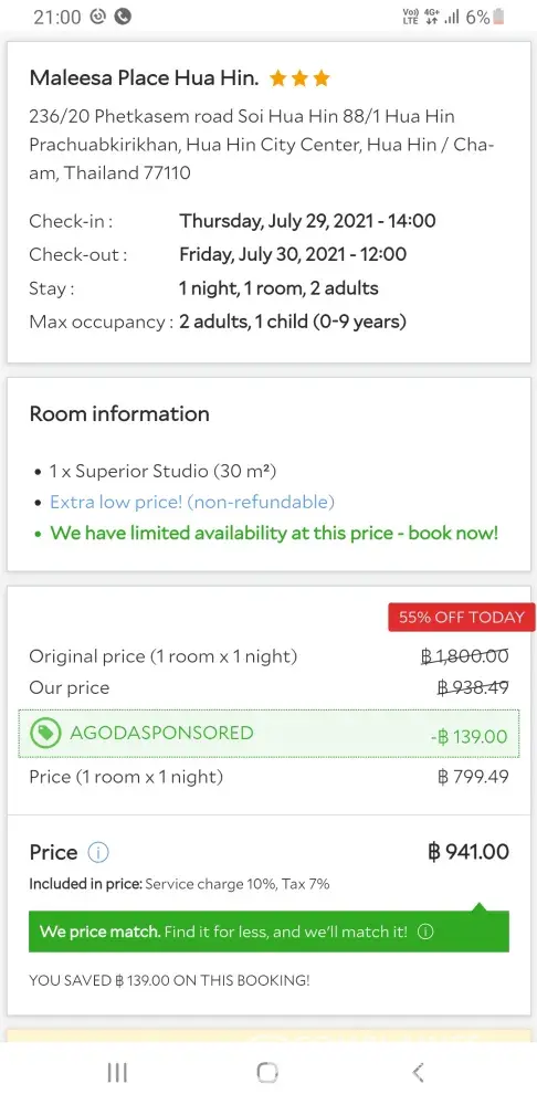 A girl from Agoda called and I explained the situation and told her about the different prices on both our mobile phone only to hear that I did the wrong booking and I made the mistake. That phone call did not end well.