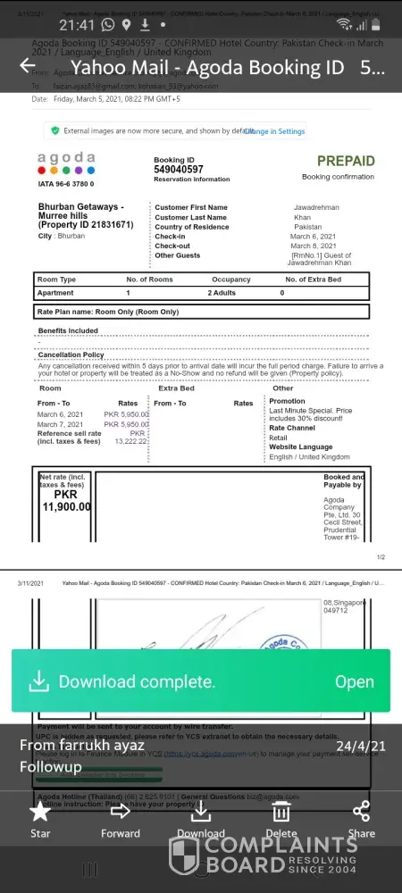 I could not contact AGODA via email to complain as we had an Internet connection problem at the company, I was at the time.