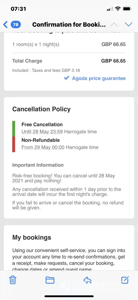 The cancellation period is until the end of today, 28th May, as shown in the attached photo. I have emailed the address on Agoda website as well as contacting the hotel directly who confirmed the cancellation but could not process the refund as I booked through Agoda.