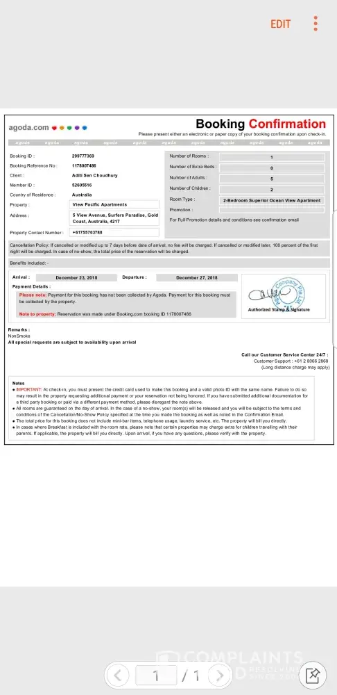 Provider is asking to cancel booking after confirmation. It was clearly mentioned on the ad as an ocean view superior room with View pacific hotel surfers paradise when I did the booking now they have come back to me asking to cancel the booking(all docs attached) stating its not a beachfront room and may not be satisfactory for 7 people.During the busy season of christmas when its do hard to find bookings its so disappointing to face this kind of am inconvenience. This is absolutely ridiculous and Iam not going to use agoda ever again as I had done the booking through them.This is an unprofessional conduct and Iam going to write on social medi to make people aware of such a terrible experinece.