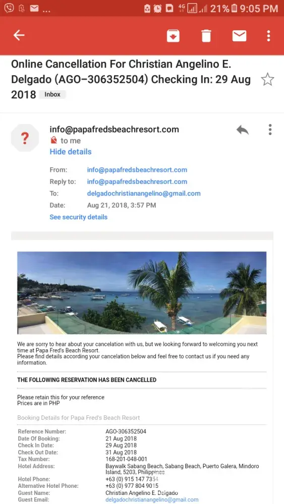 Last August 21 2018 I made a reservation with Papa Fred Beach resort in puerto galera using my credit card m with the booking Id: [protected] but on the same date and time I immediately cancelled it because I found different room. Now my billing statement has arrived and it shows that even I already cancelled the said transaction it still reflecting on my account! could you guys help me with this PLEASE! ASAP!