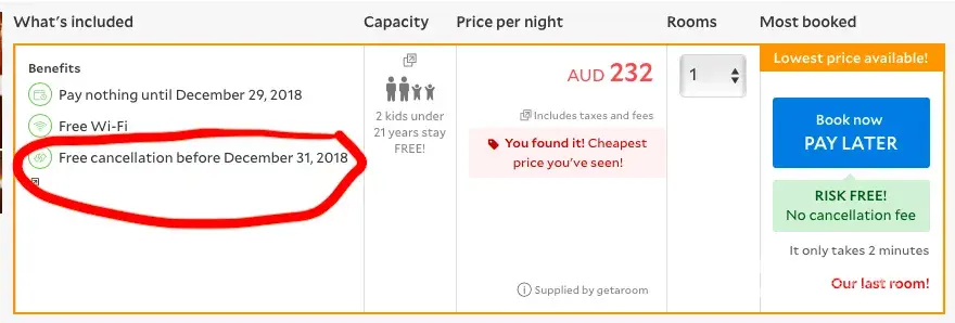 We have several screenshots from your website that clearly state 'free cancellation' and 'risk free booking'.