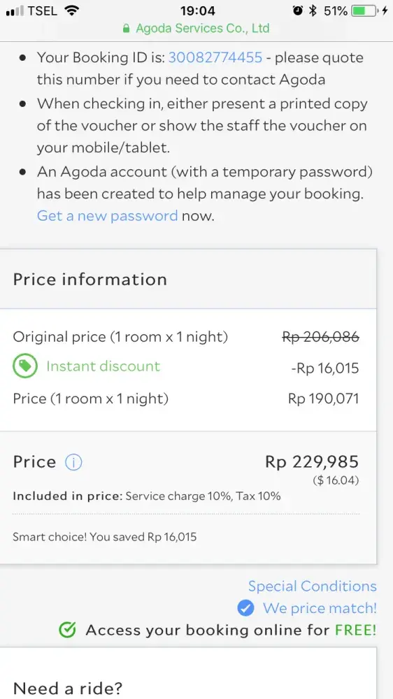 I booked and paid in full on the 31st of July THB 6381.81 (USD195.00)